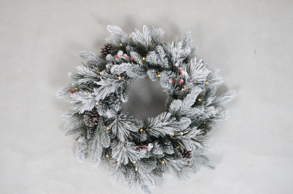 Художественное расположение веточек, гармоничное сочетание литой хвои и хвои ПВХ, встроенная LED подсветка, а также шишки и красные ягоды рябины придают венку Берта особый шарм.
