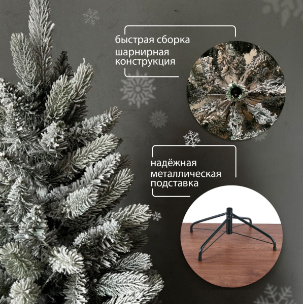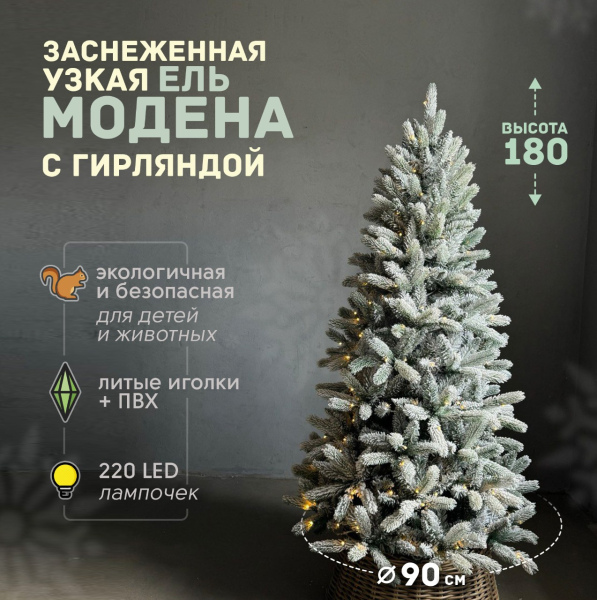 С наступающим новым годом! Представляем вашему вниманию узкую новогоднюю заснеженную (флокированную) искусственную ель с литыми ветками и встроенной подсветкой высотой 180 см. Эта белая литая елка станет отличным дополнением к вашему новогоднему декору, создаст атмосферу уюта и подарит ощущение зимней сказки. Необходимо отметить высокое качество и экологичность материалов. Она имеет уникальный дизайн и благодаря своей узкой форме легко впишется в любой интерьер и станет его украшением. Искусственный снег на ветвях придает елке натуральный вид, а встроенные огоньки создают волшебное свечение, делая елку еще более привлекательной. Широкая надежная металлическая подставка делает елку максимально устойчивой и можно не опасаться за детей и домашних питомцев. Благодаря простой конструкции, сборка займет минимум времени. Компактная упаковка позволяет удобно хранить ель, не занимая много места. Не упустите возможность приобрести эту замечательную царь елку и сделать свой дом уютным и праздничным!